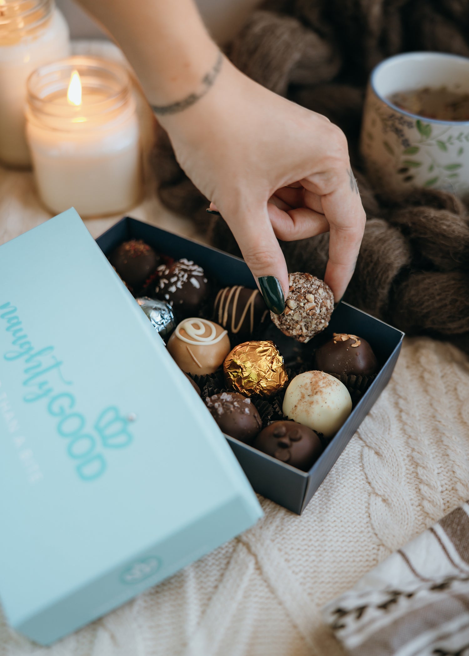 Karyn F.I waited three days to eat one of these beautifully packaged bites. They made me happy just opening the box. I waited for the moment I could savor these delectable treats. I did just what they said...cozy jammies, Netflix, some me time. So worth the wait! These NaughtyGood Bites are simply heaven.